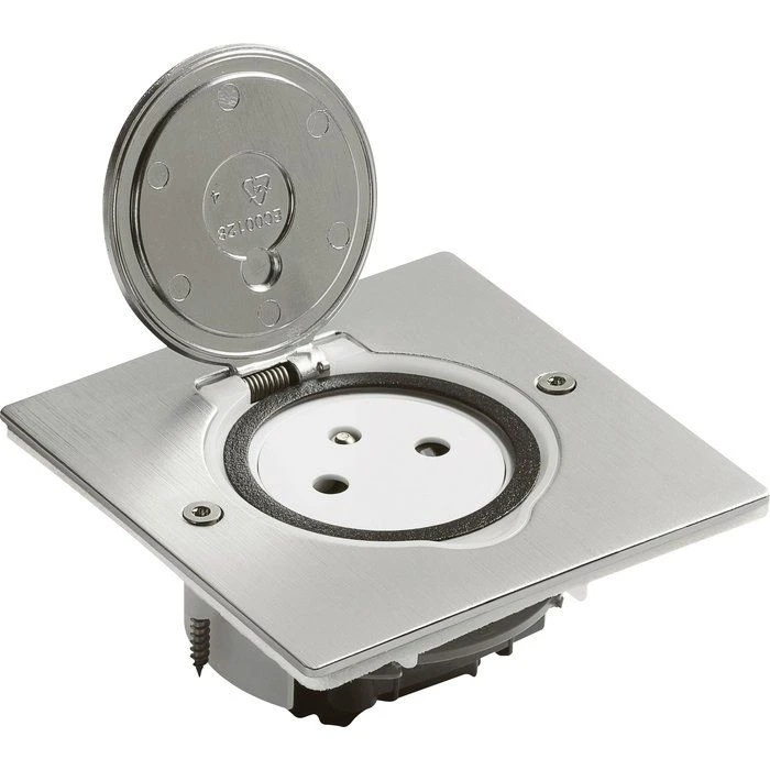 Prise de sol 2P + T SurfaceAvec couvercle de protectionPlaques extra-finesOuverture du clapet à 180°Vis de fixation : type torx inox T10Température d’utilisation : -5°C à +35°C
